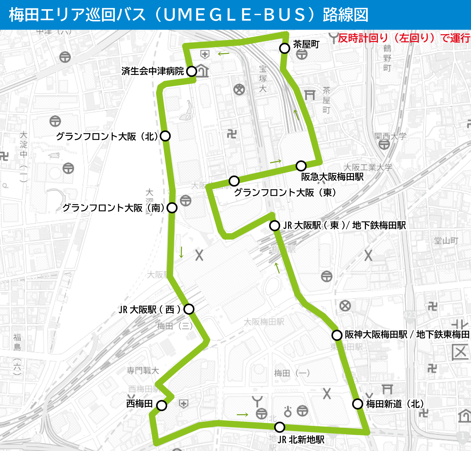 梅田エリアを反時計回り(左回り)で循環する「うめぐるバス」が2025年12月31日で運行終了となることが、グランフロント公式にて1)発表されました。