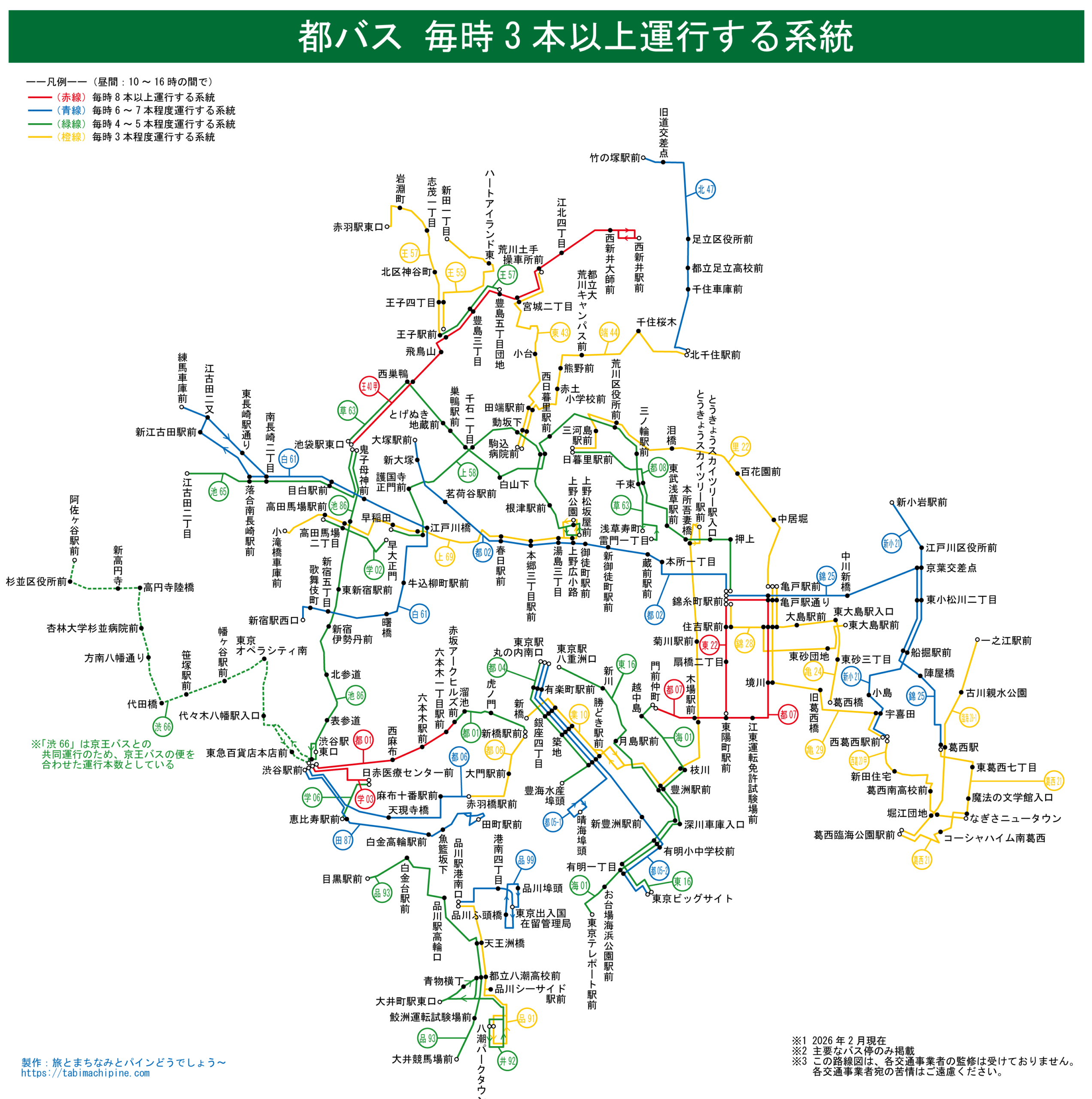 ここでは、平日・土曜・休日問わず昼間時間帯に毎時3本以上運行するバス路線に絞って、都バスの簡易な路線図を作ってみました。具体的には、(昼間時間帯にて)運行本数が毎時8本以上(赤色)、毎時6~7本程度(青色)、毎時4~5本程度(緑色)、毎時3本程度(橙色)の4つに区分けしてみました。運行本数な1時間あたりの最低値として、かなり辛めに判定しています。